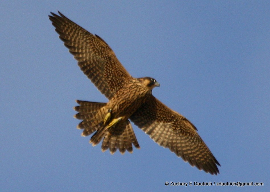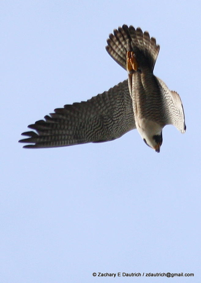 The fledglings are vocal, and the one was calling (begging) for quite a while on the Alameda tower as the one adult seemed oblivious across over on the Oakland side. Finally she was moved to take-off while still crying (see pic to the right) – she is amazingly beautiful and a good flyer already. I was so excited to get to see a mid-air food exchange between the adult male (named Hiko by his fan-base – he was actually a nestling from the nest in downtown San Jose a few years ago) and the older female fledgling (know as Marina – the other is Fern). Sadly my snap of the action came out blurry, but it’s still worth posting because it was just so awesome. It’s a good perspective also to see how much bigger the fledgling female is than the male (generally female raptors are larger than males). And she’s larger than her sister as well, a big falcon!