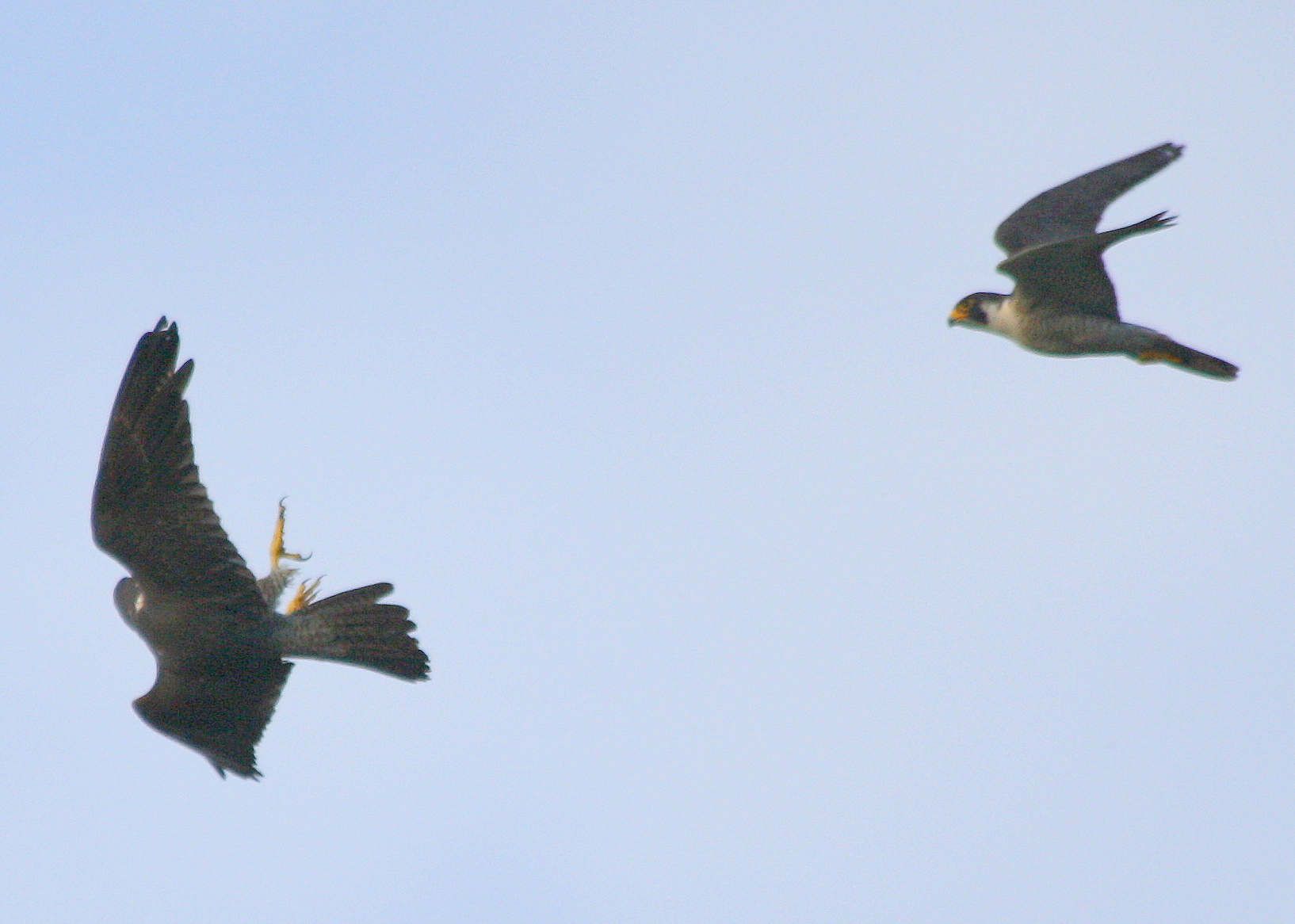 An interesting follow-up to my photos from June 2nd: it now seems likely that the falcon behavior that I ultimately concluded was “the adults playing and frolicking together in the warm late day sun, ” was in fact more aligned with my initial instinct of a third falcon invading their territory.