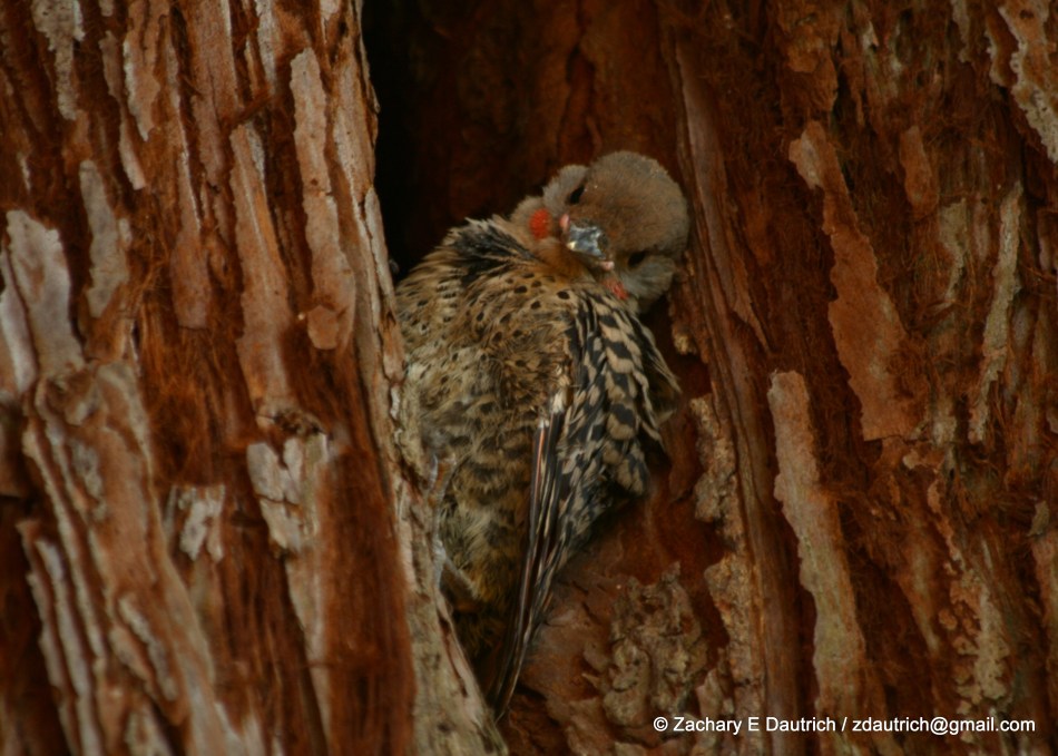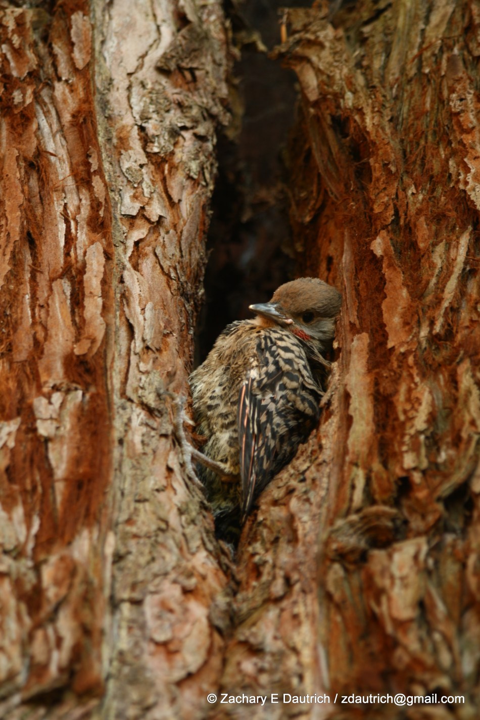 I didn’t have to go far for this experience – the other day I heard a sound like a squirrel chirping in a redwood tree in my front yard. Finally after a day of hearing it I went to see what was up (was there a squirrel stuck in the mail box?) – it is a Northern flicker nest in a cavity in the crook of a redwood tree about 15 feet off the ground. The little one seems about ready to fledge, and didn’t mind being the subject of some photos.