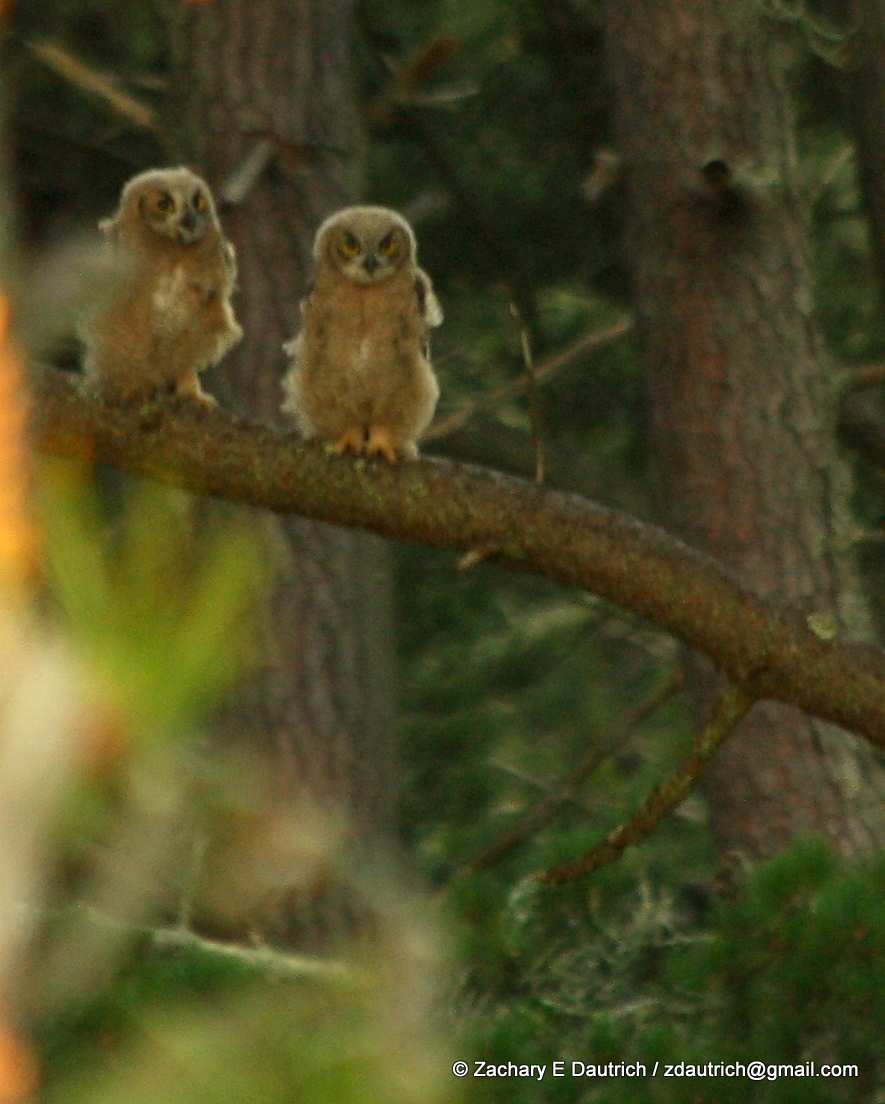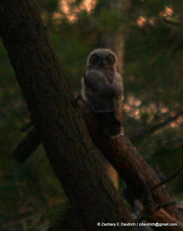 During the end of winter when we walked up here, we could hear the hooting calls echo through the cavern-like pine trees at the top of the wind and fog buffeted hilltop. These sounds have now been replaced by the screeching, begging calls of juvenile great-horned owls, evidence of a successful nesting season – and a non-stop prodding of the parents to keep filling their hungry bellies. The parents are busy from just after sunset until after dawn each day making sure the young ones get fed, and based on their incessant calling, it seems their job is never done. There are at least two fledglings, possibly a third. In the fading (or dawning) light of day it’s hard to see, much less photograph, these large and beautiful birds.