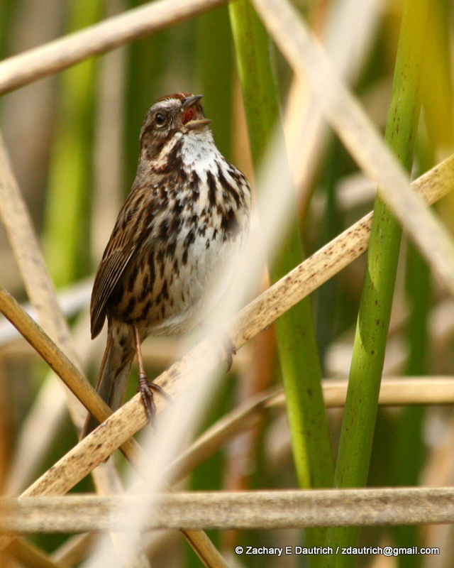 The song sparrows hopping around the tule reeds at the edge of the reservoir were singing, this one popped out and stood still long enough to allow me to watch a brief serenade.