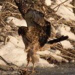 This hawk is most likely about 1 year old, quite an accomplishment to have survived its first year (raptors have mortality rates in the first year as high as 70%!). Juvenile red-tailed hawks lack a red tail, often have lighter colored eyes than adults, and have some spotty patterns on the belly band (versus more streaking in adults). It seemed relaxed as it faced the setting sun, evidenced by its fluffed-out feathers and its left leg lifted up into its belly feathers. You can see on the right leg, there appears to be a band on this bird – possibly it was caught and banded during the migration last year.