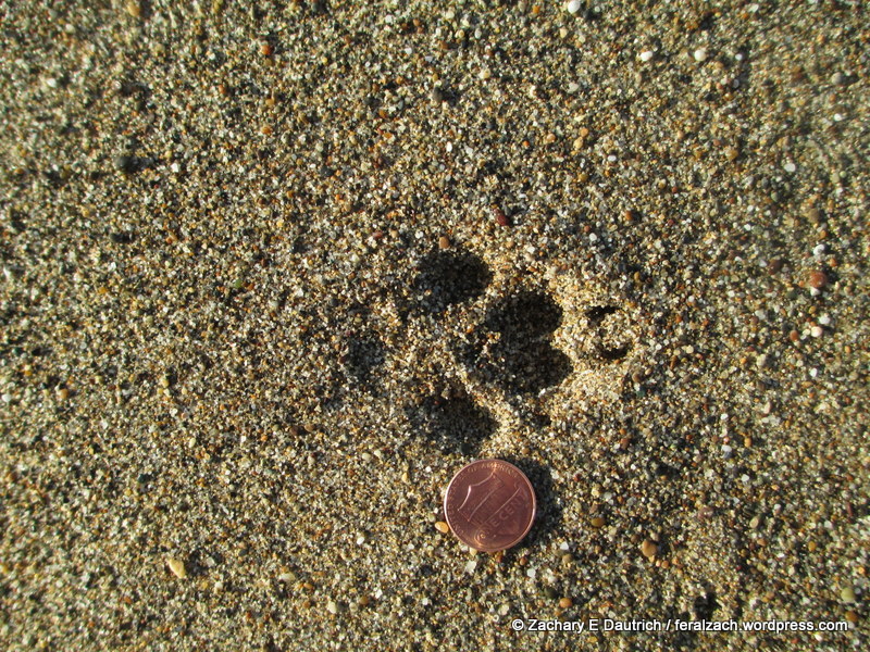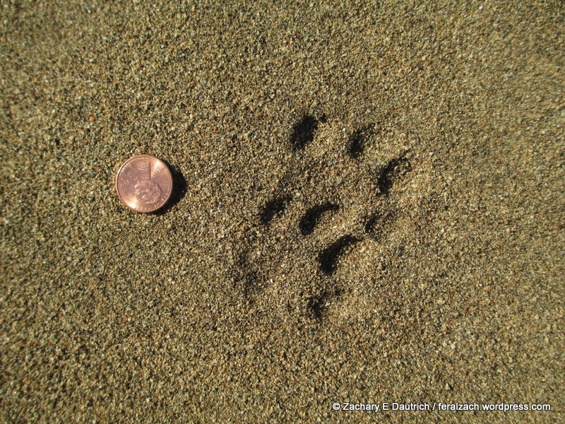 I trailed one of them for half a mile down the beach, its tracks following the vegetation line at the edge of the beach, at one point going down into the surf area where the water washed away its paw prints at the last high tide before it veered back up to continue on its journey north towards Kehoe Beach (where their sign is much more prevalent according to others familiar with the area). It was a very purposeful gait, seldom stopping to investigate the ocean flotsam along the shore. What spurred this fox on an unhurried yet purposeful journey on the beach? The search for a mate? A territorial scouting mission? Food? It will be interesting to see if there is more sign in the future or if the foxes will remain more north towards Kehoe beach after this.