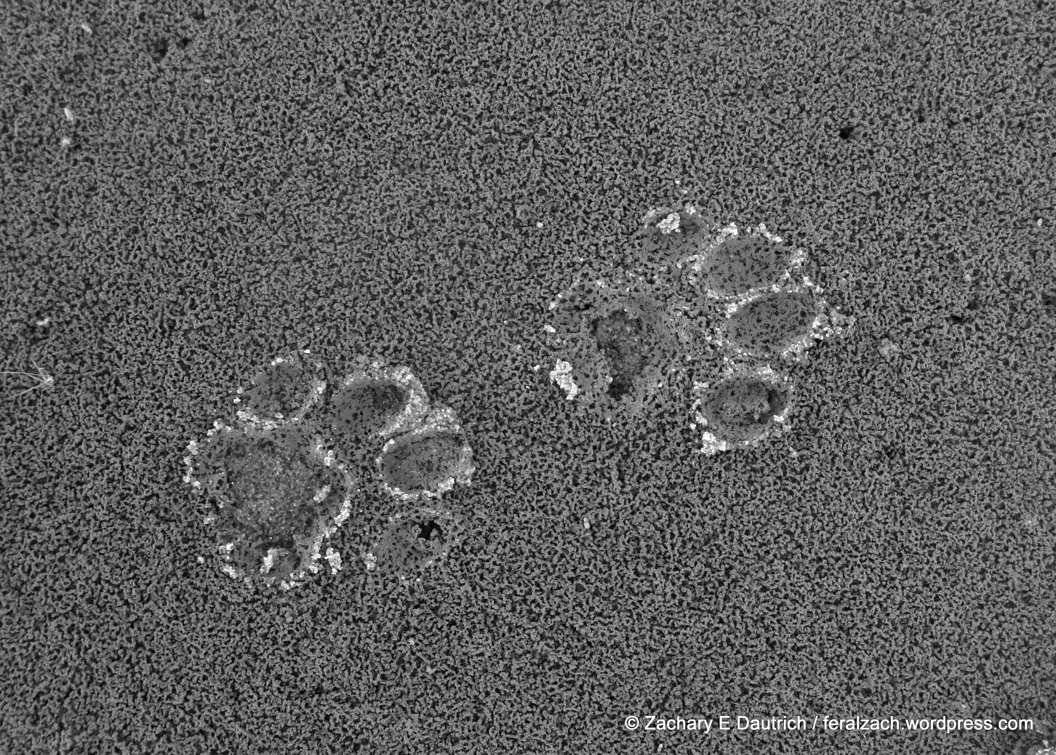 Bobcat tracks (nice shot of front and rear) – based on the size and the shape, we decided it was likely a male
