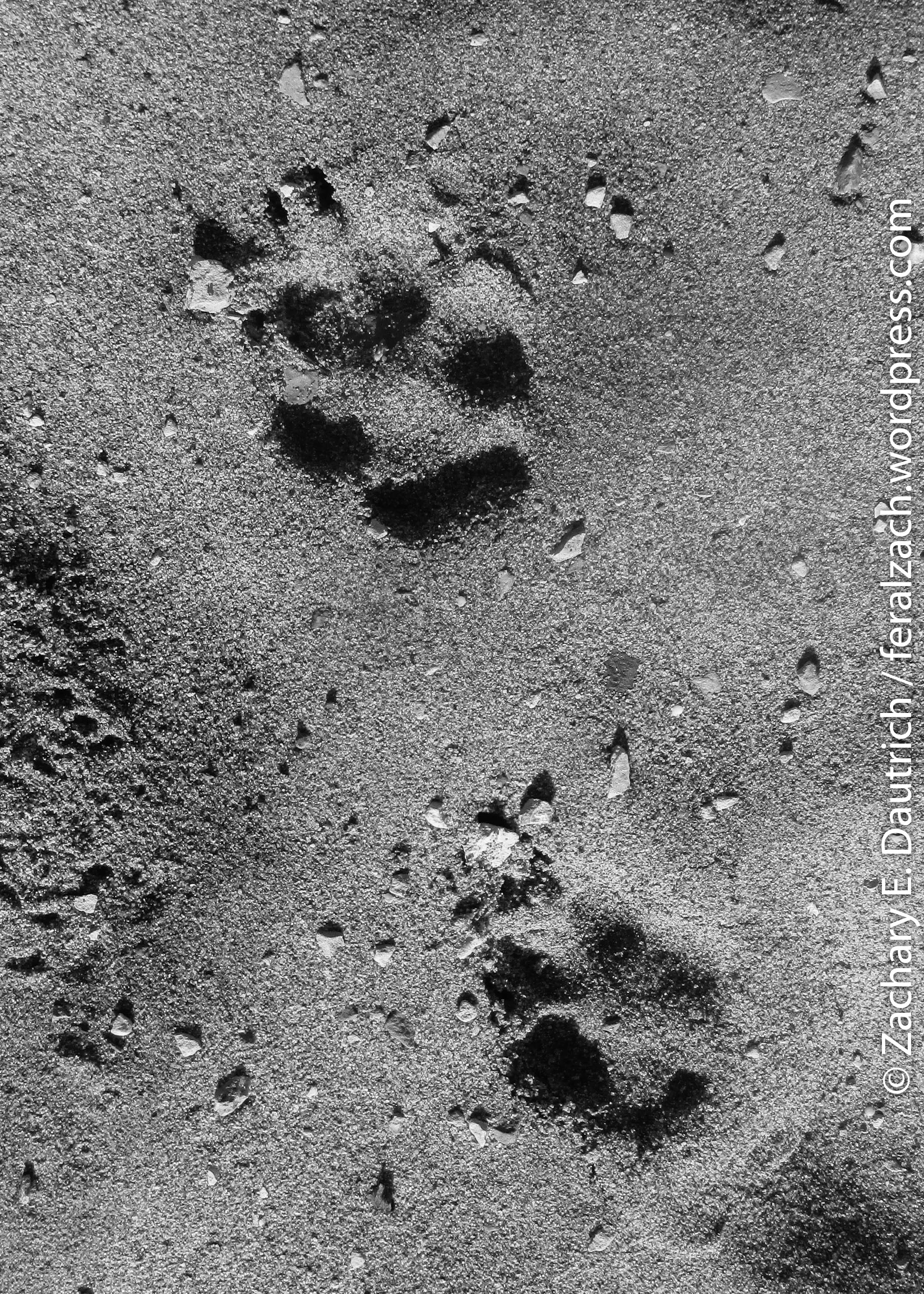 This particular area usually is thick with coyote sign, and seldom have we seen gray fox sign here – but this day showed evidence of at least one fox that had traveled with purpose around the whole area. The tracks are dainty next to the many coyote tracks, and I was excited to see find the trail.