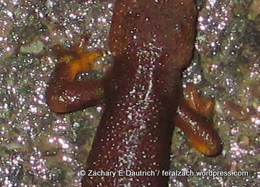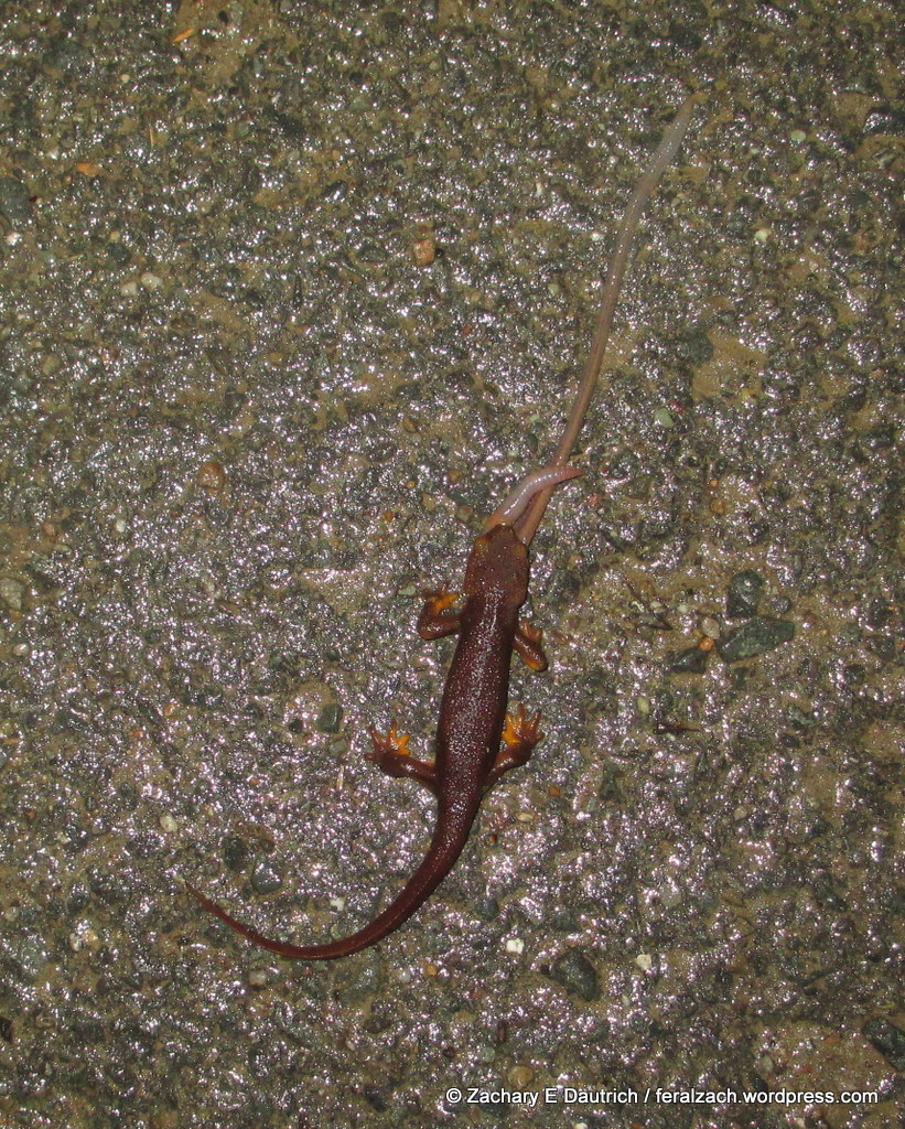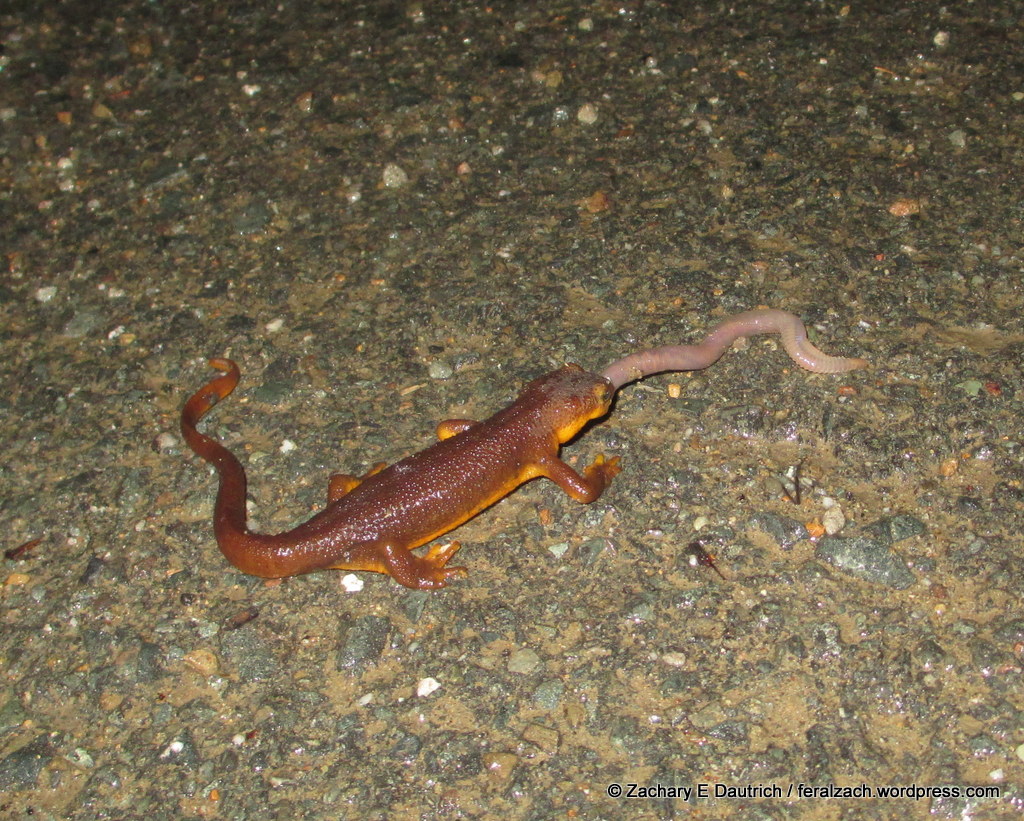 As I hopped down the side of the hill, I noticed a number of newts were also out enjoying the rain. Towards the bottom near the parking area, I found one of them enjoying some breakfast – an earth worm!