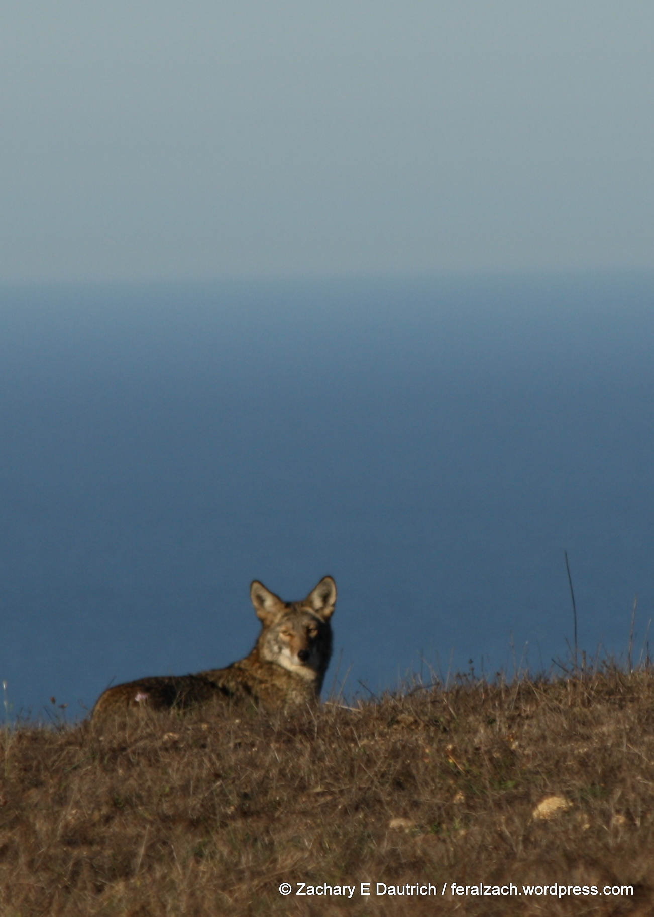 As I was quietly coming up a saddle from the main flat area down towards another little flat area, I saw a few young steer that started to move away from me – unused to seeing a person up there, I imagine. Also unused to seeing a person up there was the coyote that I just caught a glimpse of as it left its resting spot at the top of the saddle and slipped over the hill top out of sight, just 25 feet from me. I decided to have a little bit of fun with it, so I dropped down off the saddle towards a ravine that was thick with bay laurel trees and some oaks. I could hear the coyote moving there just out of sight below me as it trotted and paused in the crunchy dead leaf hubris of the forest floor, and for some reason I decided to give a short little bark. It was an earnest attempt to connect with this other being, not much thought went into it other than a deep desire to say hello.