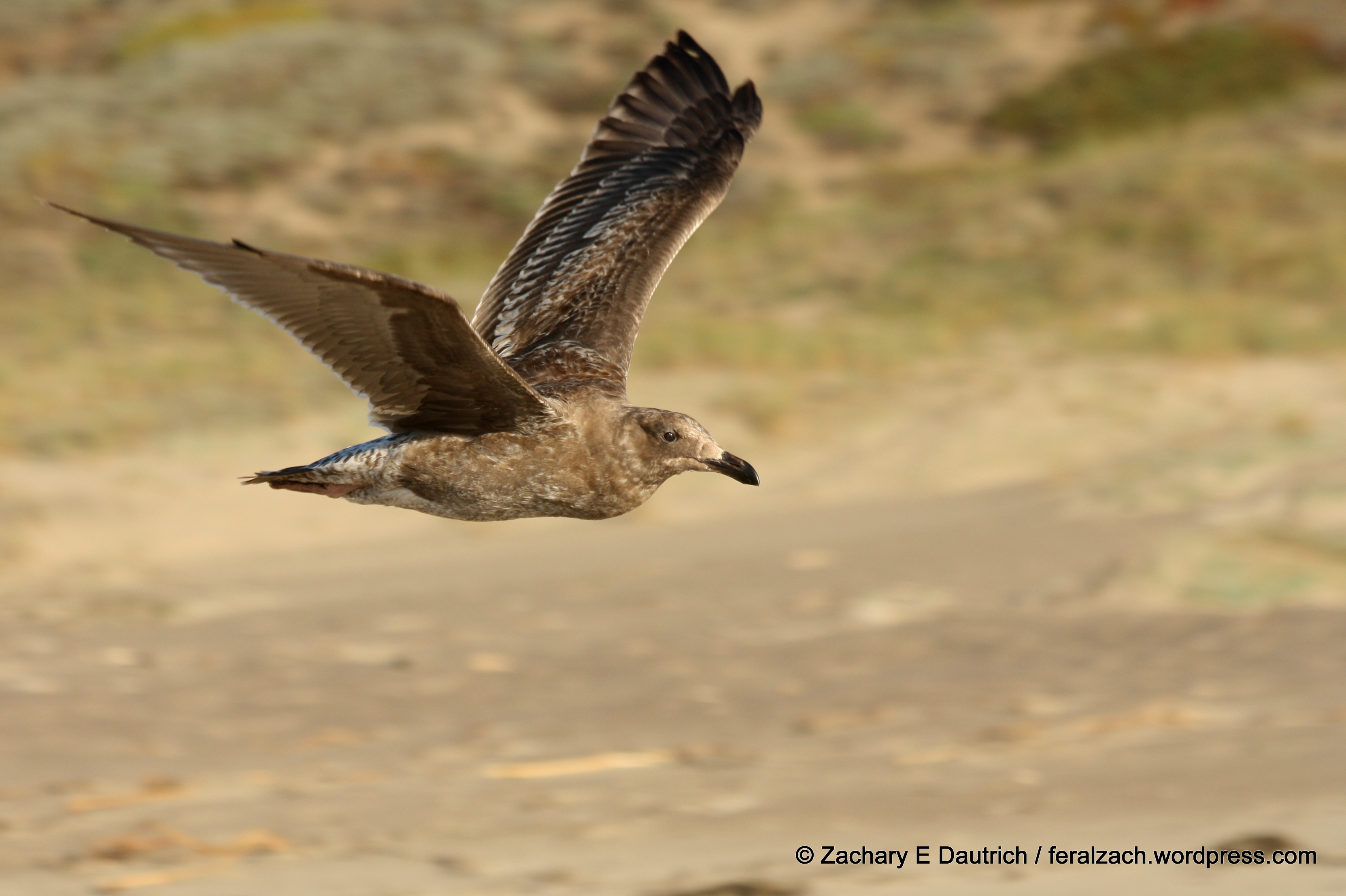 I didn’t get a picture, but we observed what we believed to be two or three pomarine jaegers (a type of flying sea bird) offshore attacking some elegant terns out at an area where many birds were feeding. It was my first sighting of this species, and evidently it’s uncommon to see them from shore (usually they are seen from boats further out to sea). There were quite a few dead murres along the beach, these are also ocean-going birds, but curiously they come onshore almost exclusively to die. Often people see these birds on the beach and try to save them, not realizing that they are already doomed. Many a kind-hearted person has been confused and heart-broken trying to help these birds. I photographed one last year down towards Moss Landing near Monterey. They look a bit like penguins when they are sitting or moving out of the water.