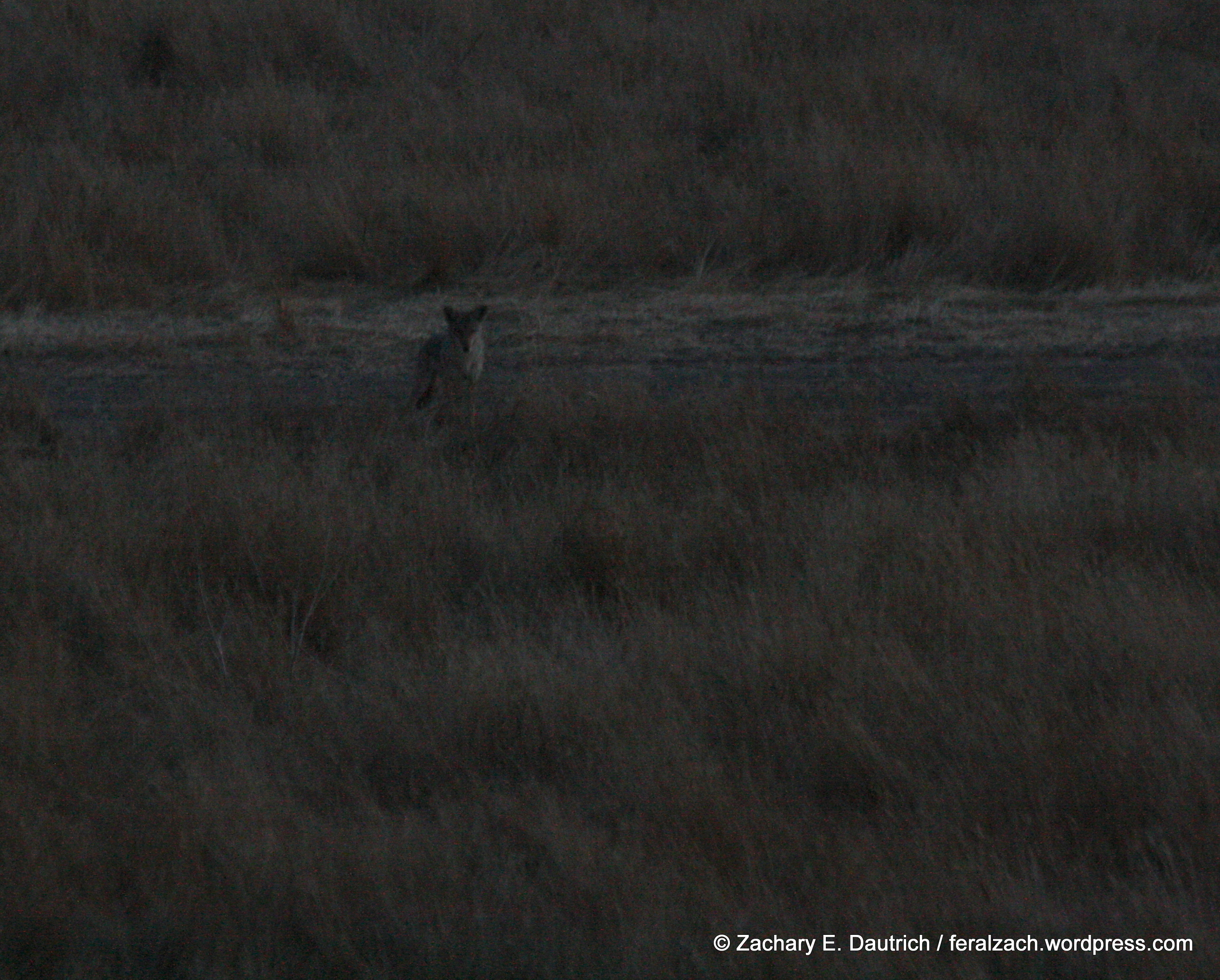 After it took off, a quick movement caught my eye on the other side of the reeds along the snowy dirt road on which I was positioned. The roads are raised on levies to allow navigation through the wetlands. Most of the water is frozen though, and what I saw was a coyote moving away from me parallel to the road. Once my eyes locked onto it, it sensed it and increased its speed, changing from a trot to a full-on bounding gait as if I were in pursuit! I am willing to bet there are hunters out there that take shots at them.