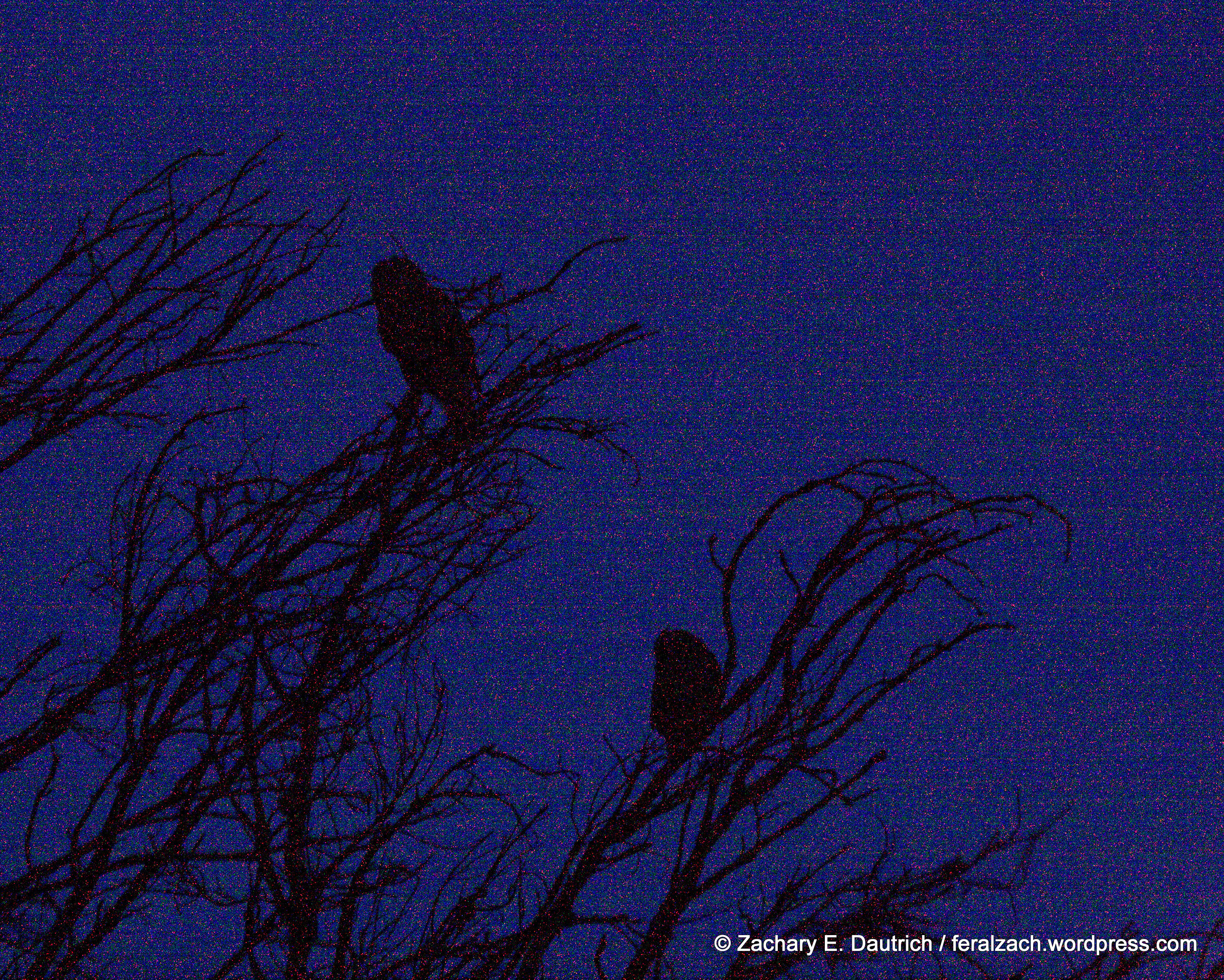 The owls were now making so much noise I had to go over to check it out. There was very little light left in the sky, but as I approached the treeline I was able to make out two juvenile great-horned owls perched up in the oaks. Occasionally they would hop to another branch, or dislodge one another in turn from their perches in what seemed like youthful play, and perhaps inpatient anticipation of their first meal of the “day.”