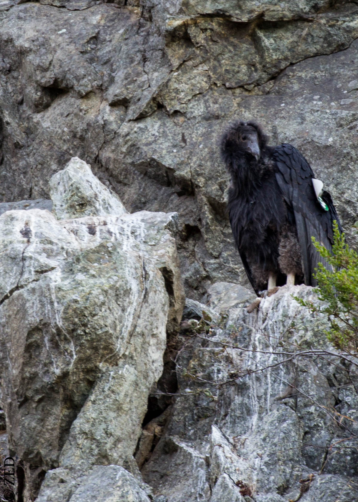 This is a California Condor chick, almost ready to fledge, at a cliff near Big Sur in the Ventana Wilderness, part of Los Padres National Forest. An incredibly endangered bird, there are less than 500 in the world (of which only about 240 are free-flying and wild, with only about 70 in this area of California) – brought back from a population of just 22 remaining in 1987! Thanks to the incredible dedication and cooperation of many groups, these birds have a second chance.