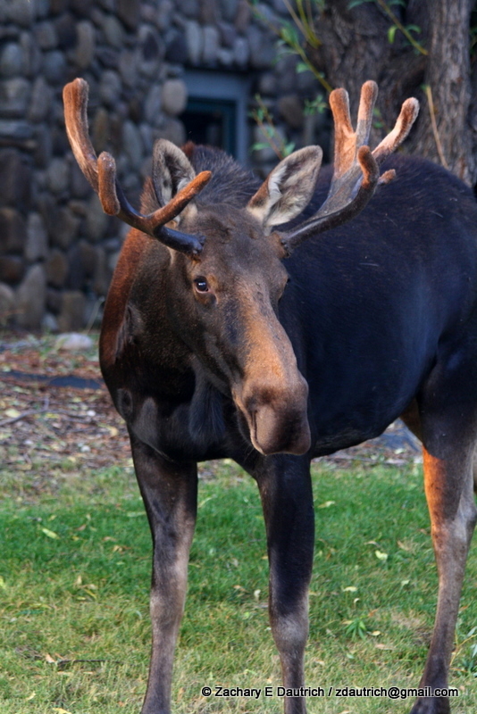 A young bull moose made his way through the small town of Kelly one evening, calmly browsing on roof-high trees and bushes.