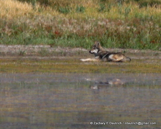 As I watched her, it started to occur to me that, while it was amazing to see her chilling by the lake, it left two other wolves unaccounted for. And I was essentially pinned in by the lake, the willows, and the hillsides around me. Not that I really expected that they would be trying to flank me and give me a surprise, but why chance it? It was my first experience with wolves, and they are intelligent animals. And big. Very big.