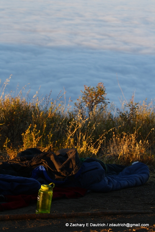 In the morning I awoke several times before dawn in a half-sleep state, seeing the brightly shining planet Jupiter leading the sun up in the orange sky to the East. The moon still claimed the heavens though, sitting to the West in the purple light above the layer of fog over the Pacific Ocean.